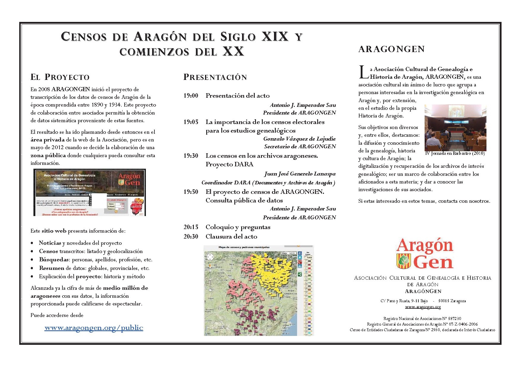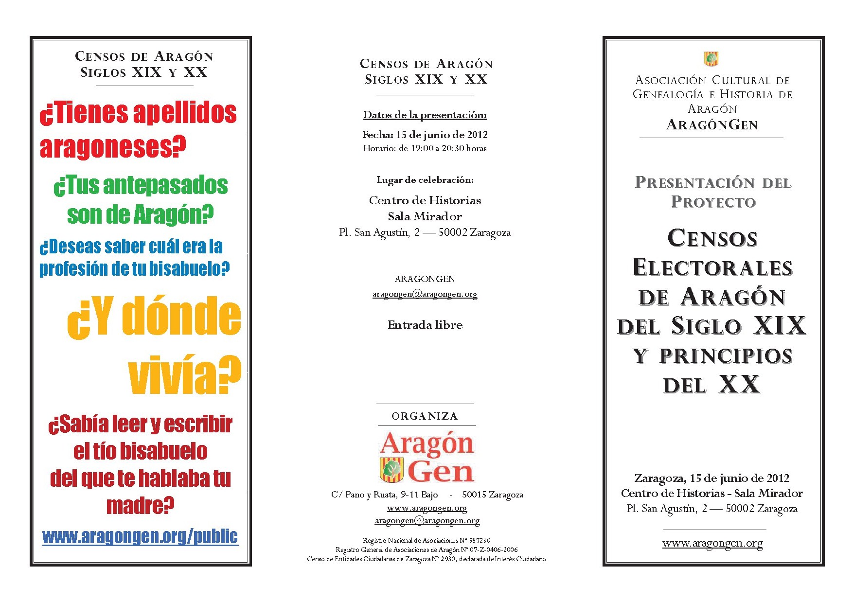 El viernes 15 de junio de 2012 en horario de 19:00 a 20:30 se llevará a cabo el acto de presentación del Proyecto de Censos en Aragón de finales del siglo XIX y principios del XX. Dicho acto será realizado en la Sala Mirador del Centro de Historias de Zaragoza (Plaza San Agustín 2, 50002 Zaragoza)